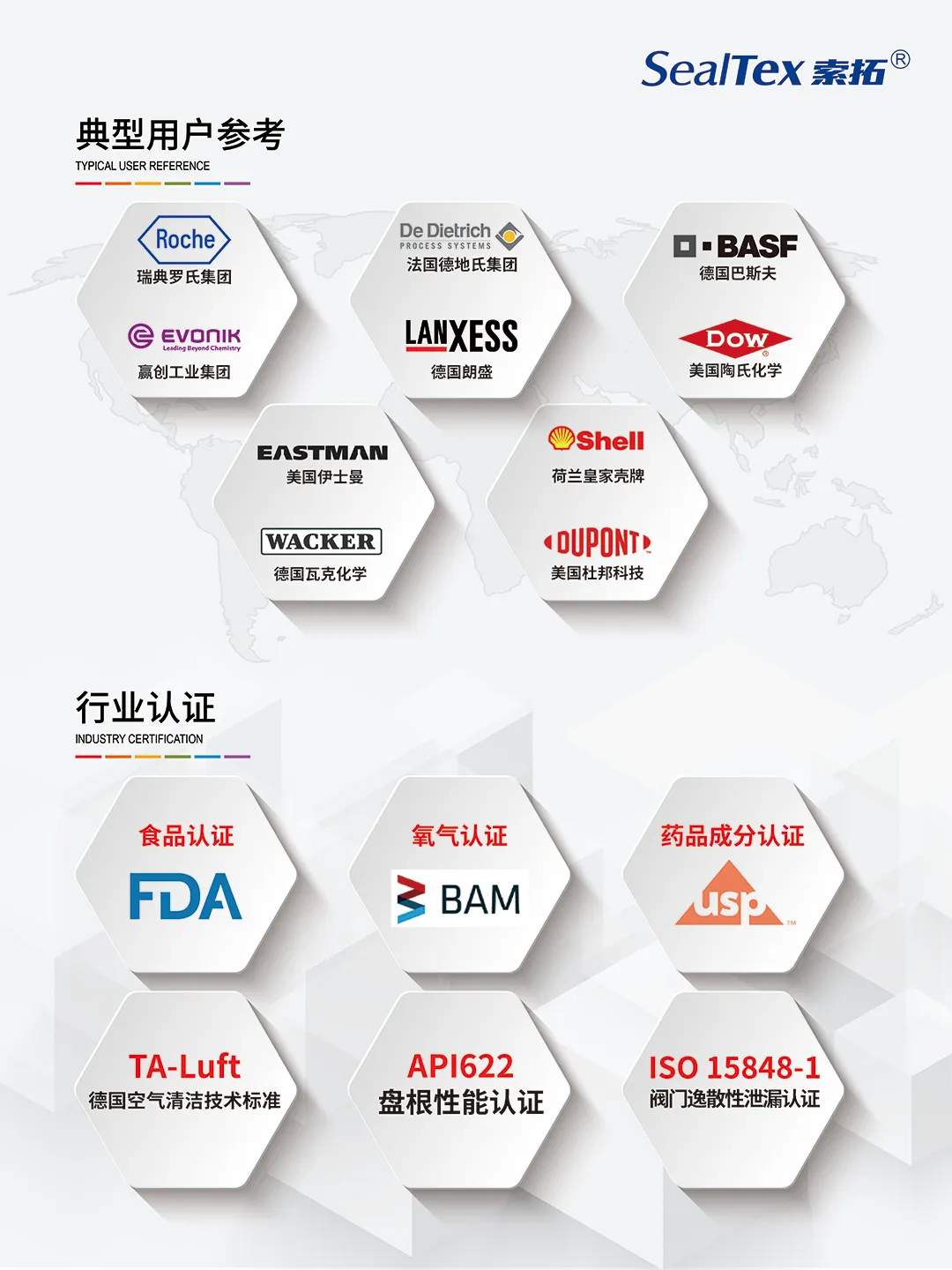 我司代理合作品牌TEADIT泰迪已為全球多家知名化工企業(yè)提供密封解決方案服務(wù),例如:BASF巴斯夫、Shell殼牌、Roche羅氏等。且產(chǎn)品可滿(mǎn)足FDA、BAM、DVGW、ups、TA-Luft、API622、ISO 15848-1等不同標準要求。還在耐高溫、耐腐蝕等性能上表現出色,能夠滿(mǎn)足天然氣、石油、化工等嚴苛工況下的密封需求
